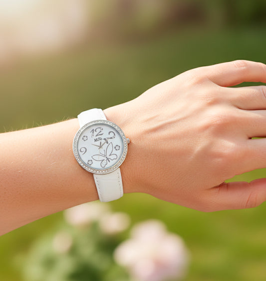 Reloj Micro Butterfly Silver – Correa Blanca, Cristales y Diseño Floral