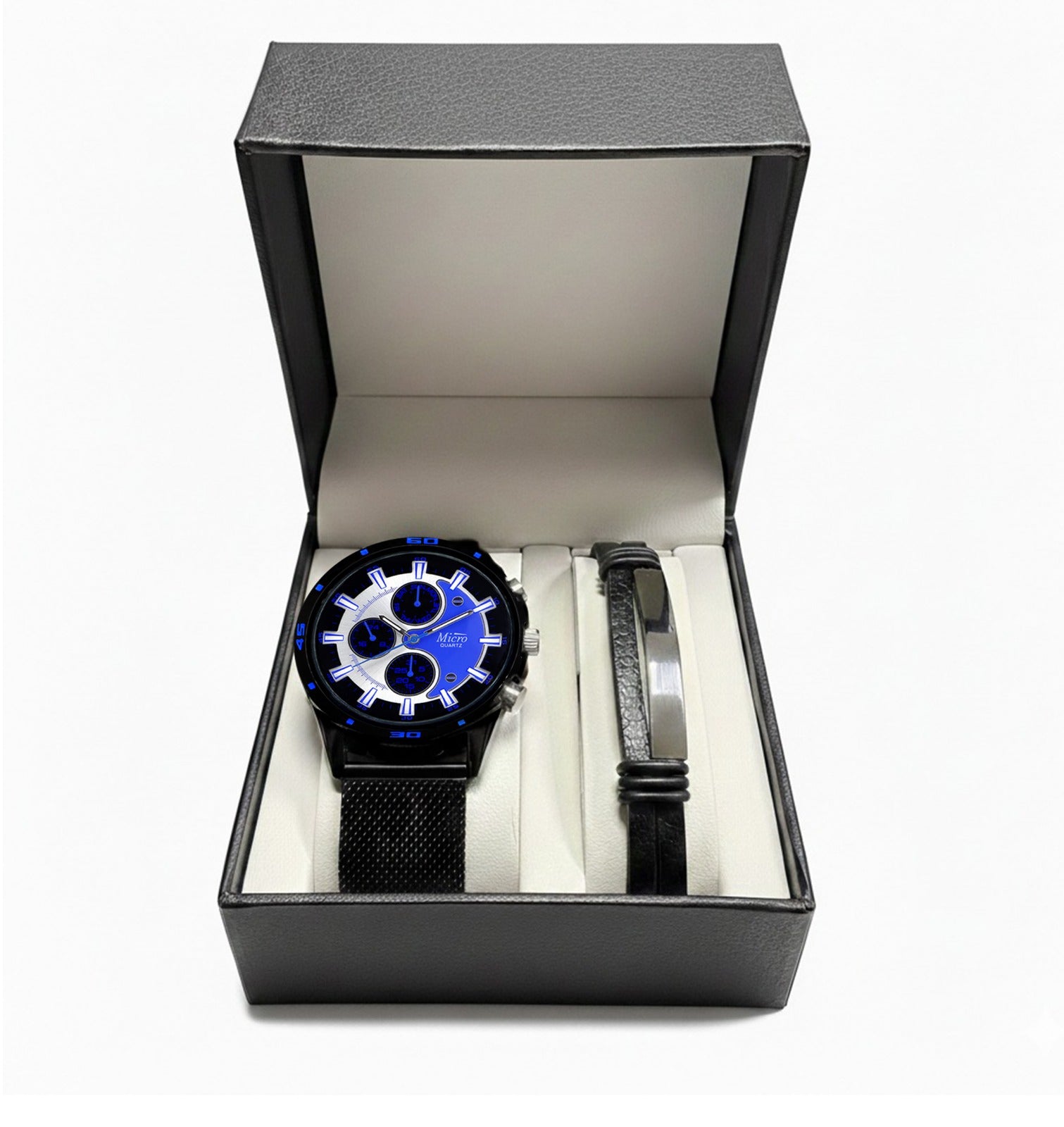 Este pack especial de Día del Padre combina nuestro imponente reloj Micro Chrono en acabado negro con detalles azules eléctricos, junto con una pulsera masculina de diseño sobrio y elegante.