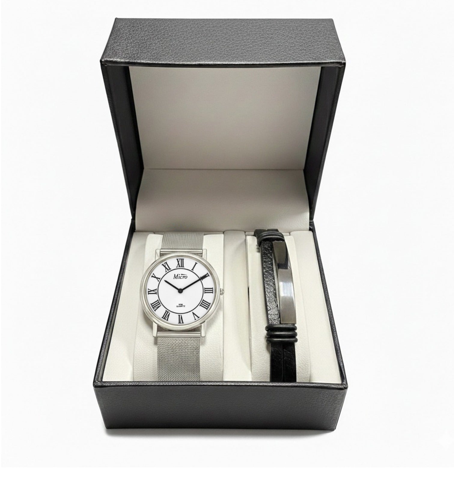 Este pack especial de Día del Padre combina nuestro reloj Micro Classic con numeración romana y brazalete tipo malla milanesa en acero, junto con una pulsera masculina en negro con detalle central en acero.