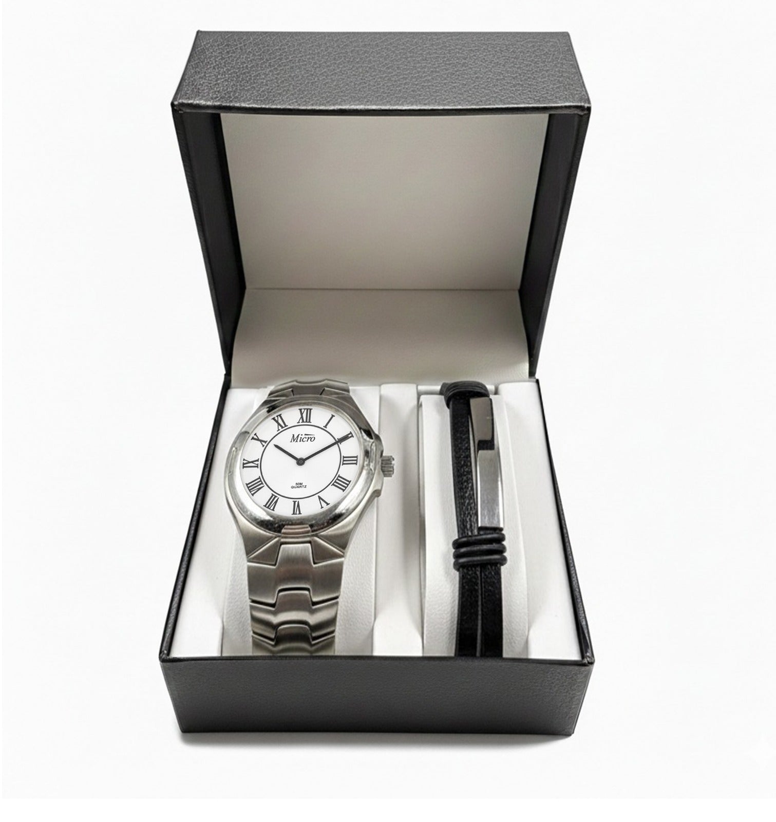 Este pack especial de Día del Padre combina nuestro reloj Micro Classic con numeración romana y brazalete de acero macizo, junto con una pulsera masculina en negro con detalle central en acero.