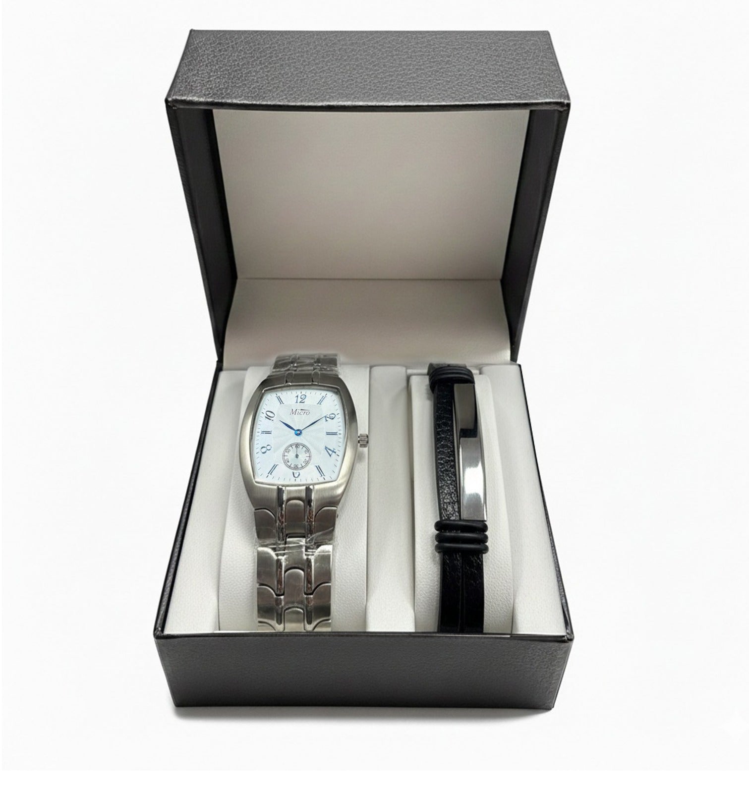 Este pack especial de Día del Padre combina nuestro reloj Micro con caja curvada tipo tonneau y pequeño segundero inferior, junto con una pulsera masculina en negro con detalle central en acero.