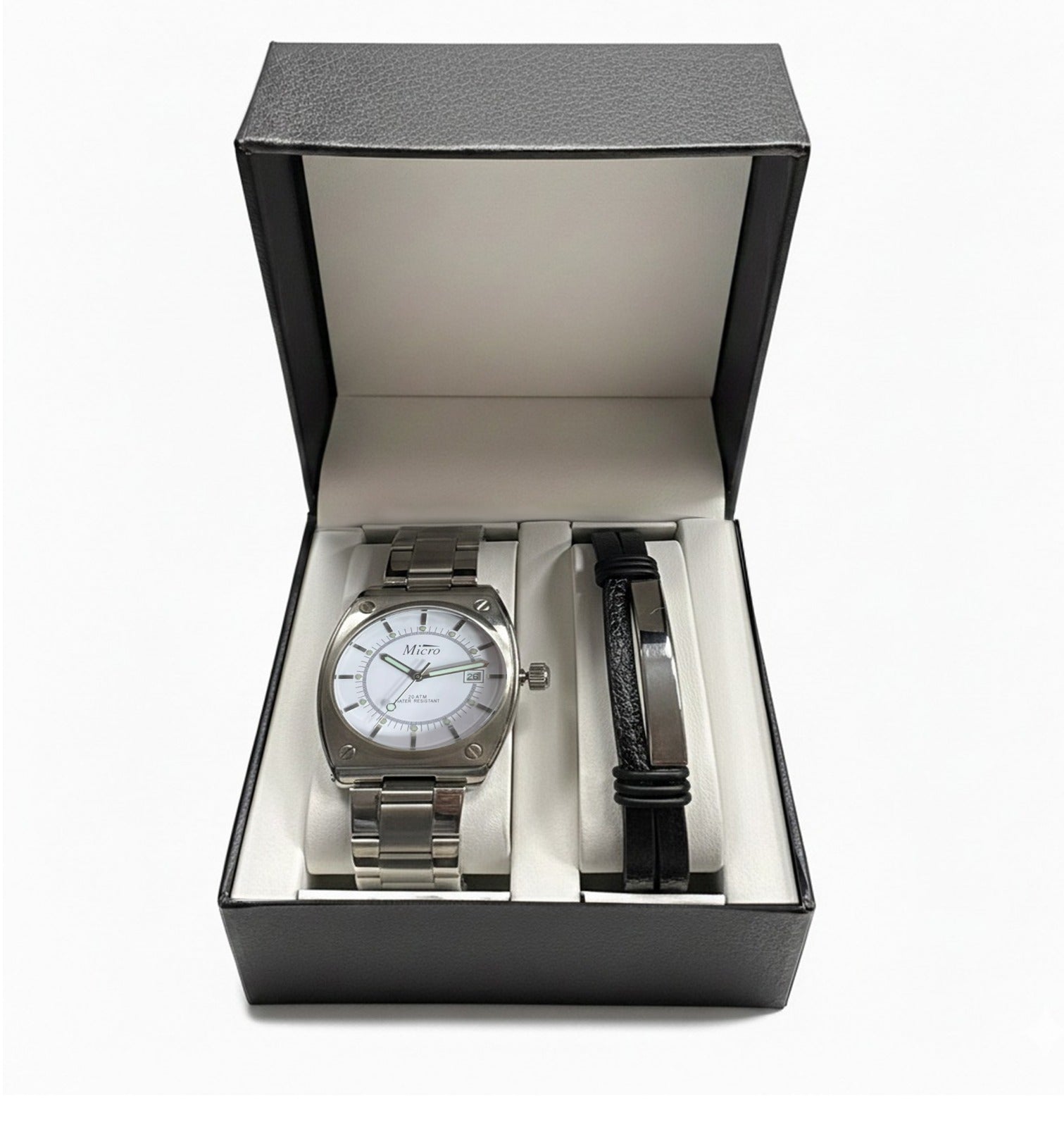 Este pack especial de Día del Padre combina nuestro reloj Micro con diseño de inspiración técnica y brazalete de acero, junto con una pulsera masculina en negro con detalle central en acero.