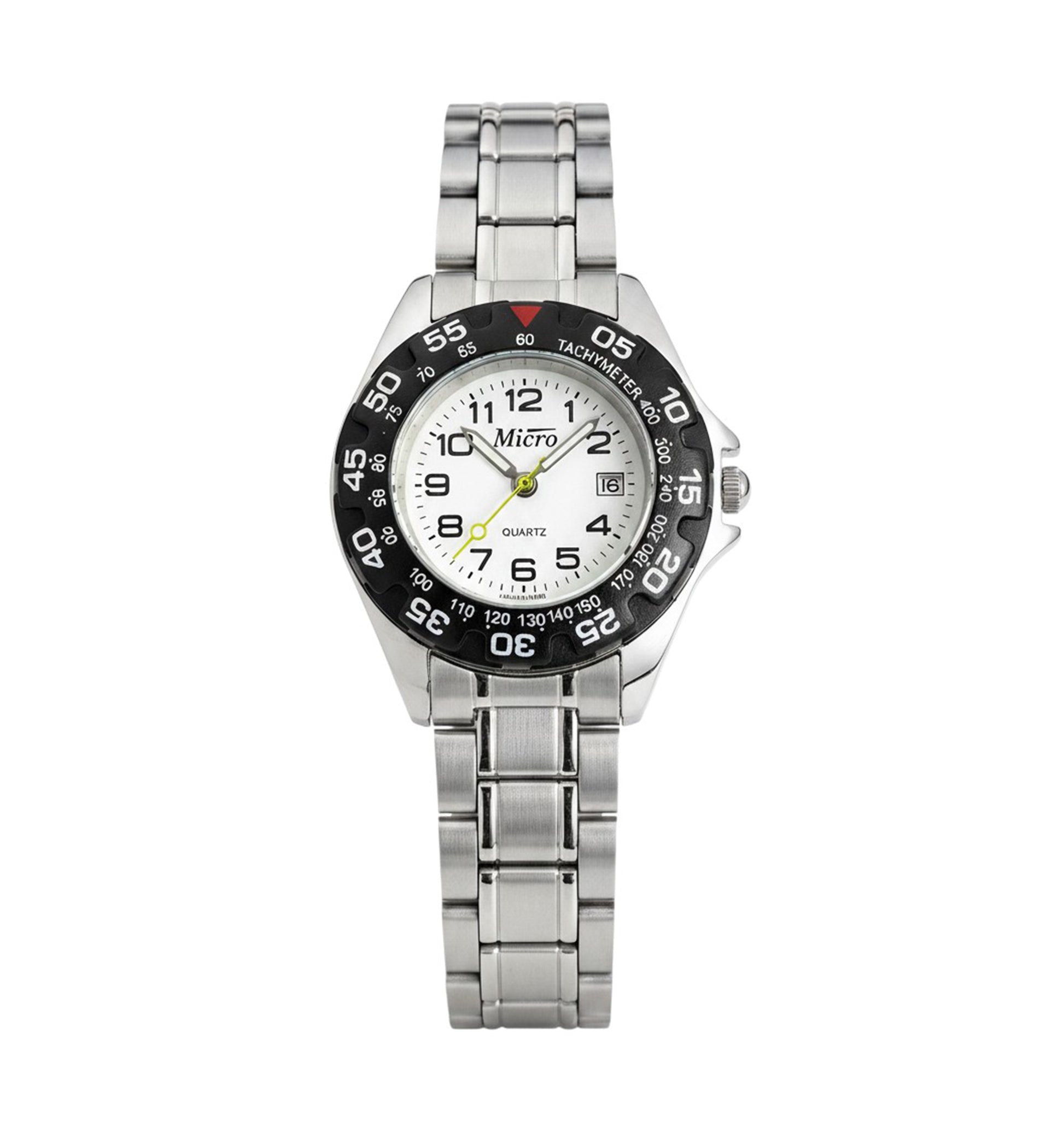 Fabricado en acero inoxidable, cuenta con bisel negro con taquímetro, esfera blanca de alta legibilidad y calendario a las tres.